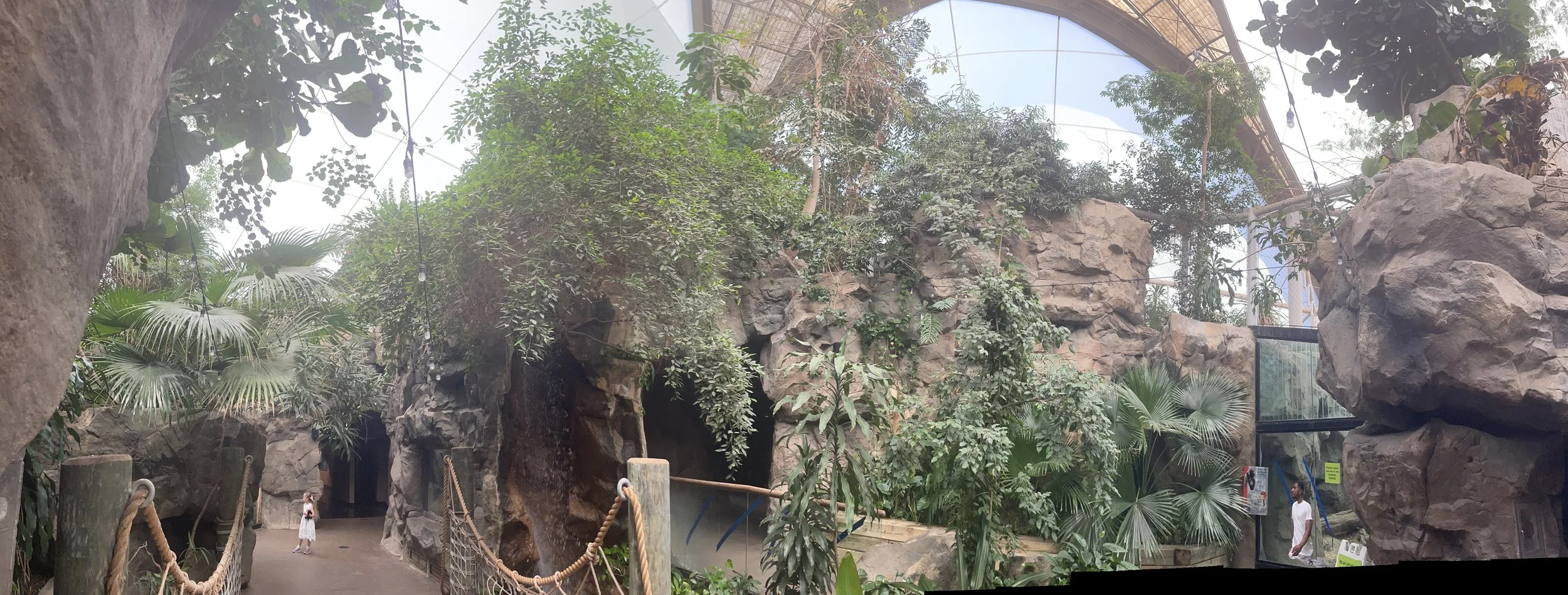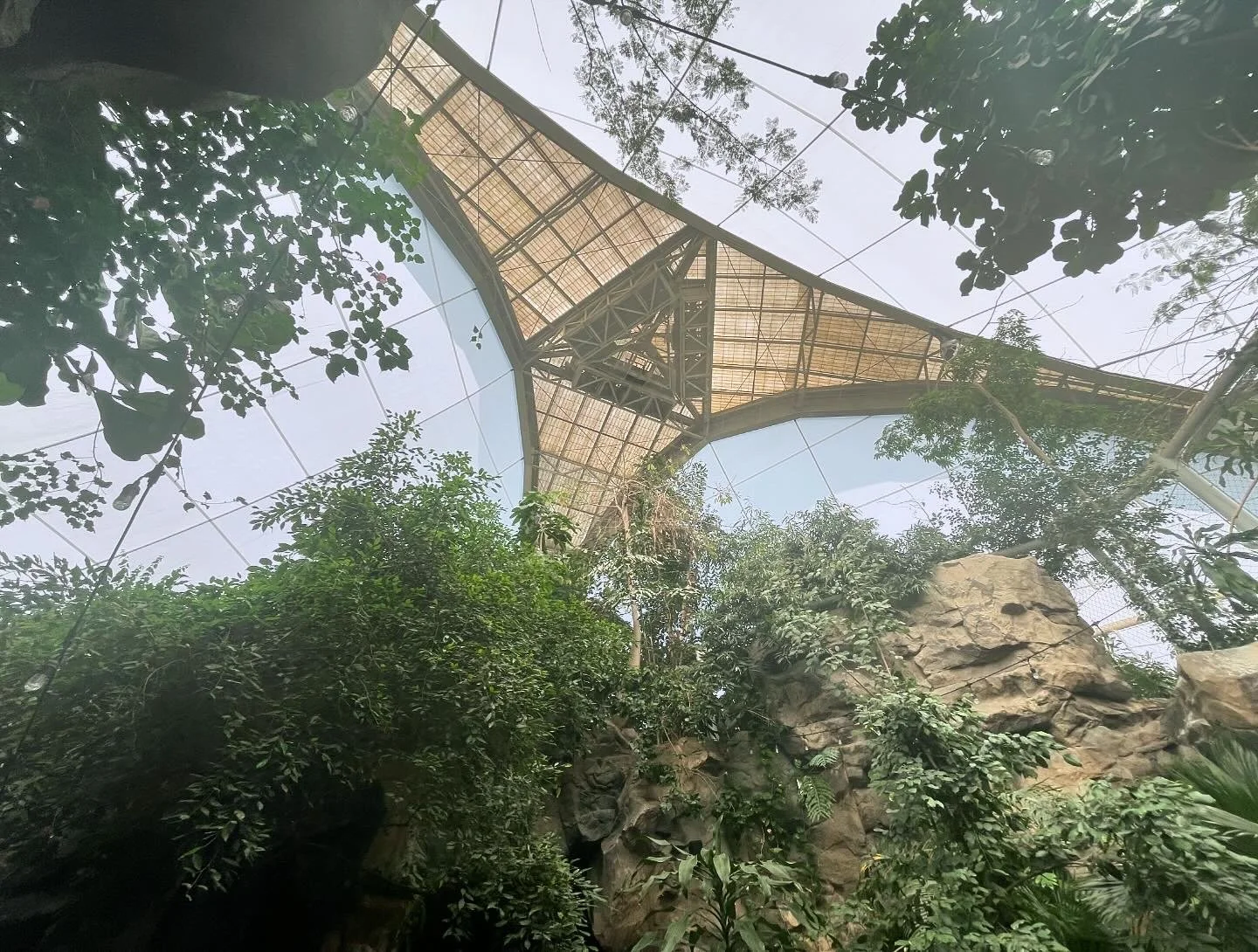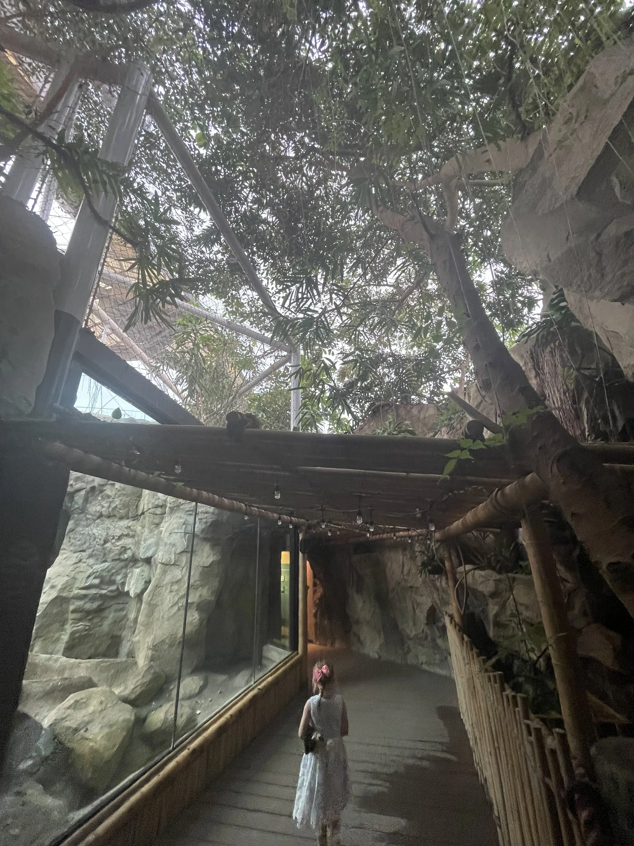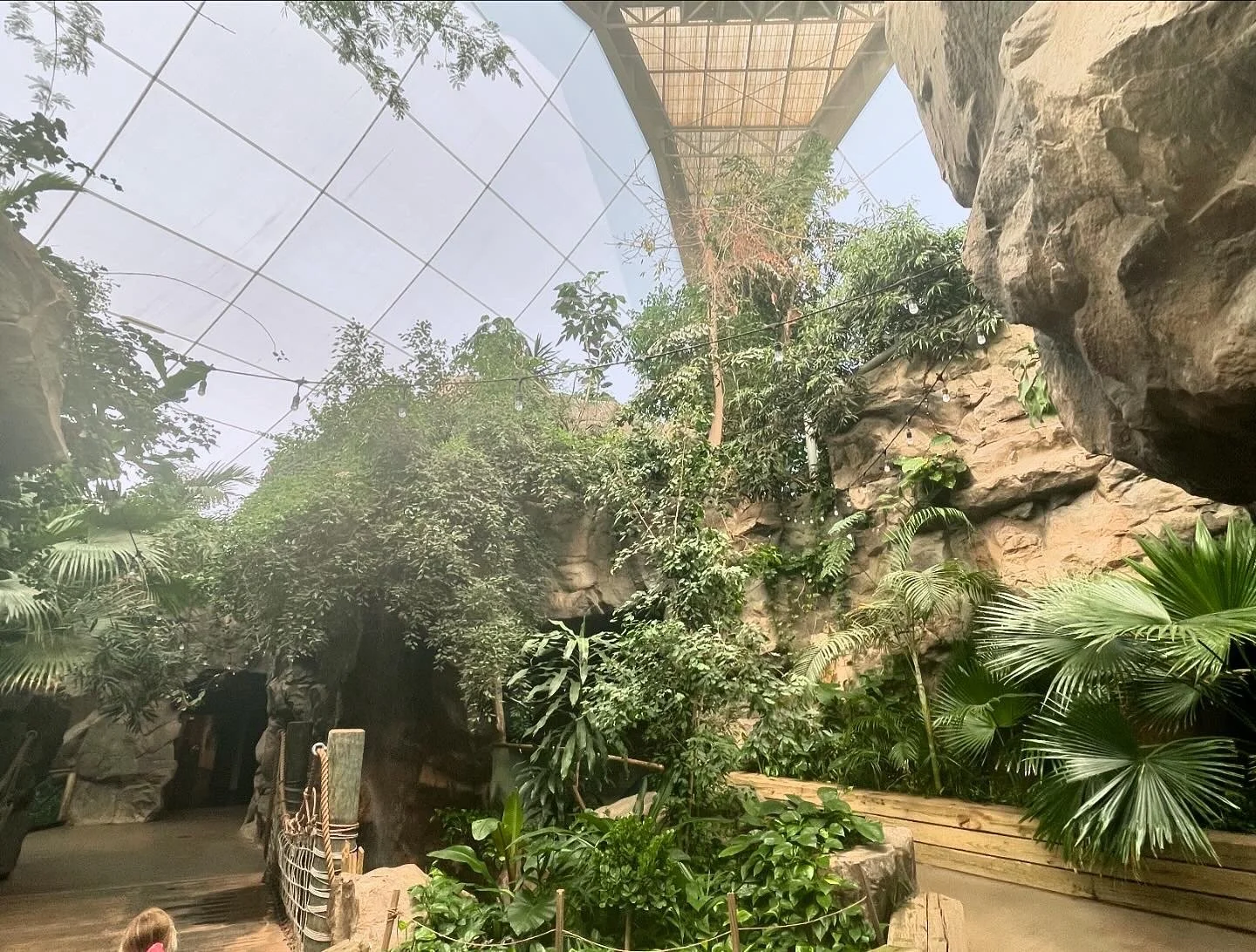 Inside, a meandering pathway takes visitors through multiple microhabitats teeming with life - from broadleaf understory plantings to canopy walkways overlooking a central gorilla habitat. Water features, warm temperatures, and high humidity create a richly immersive environment for both animals and guests, blurring the boundaries between exhibit and ecosystem.