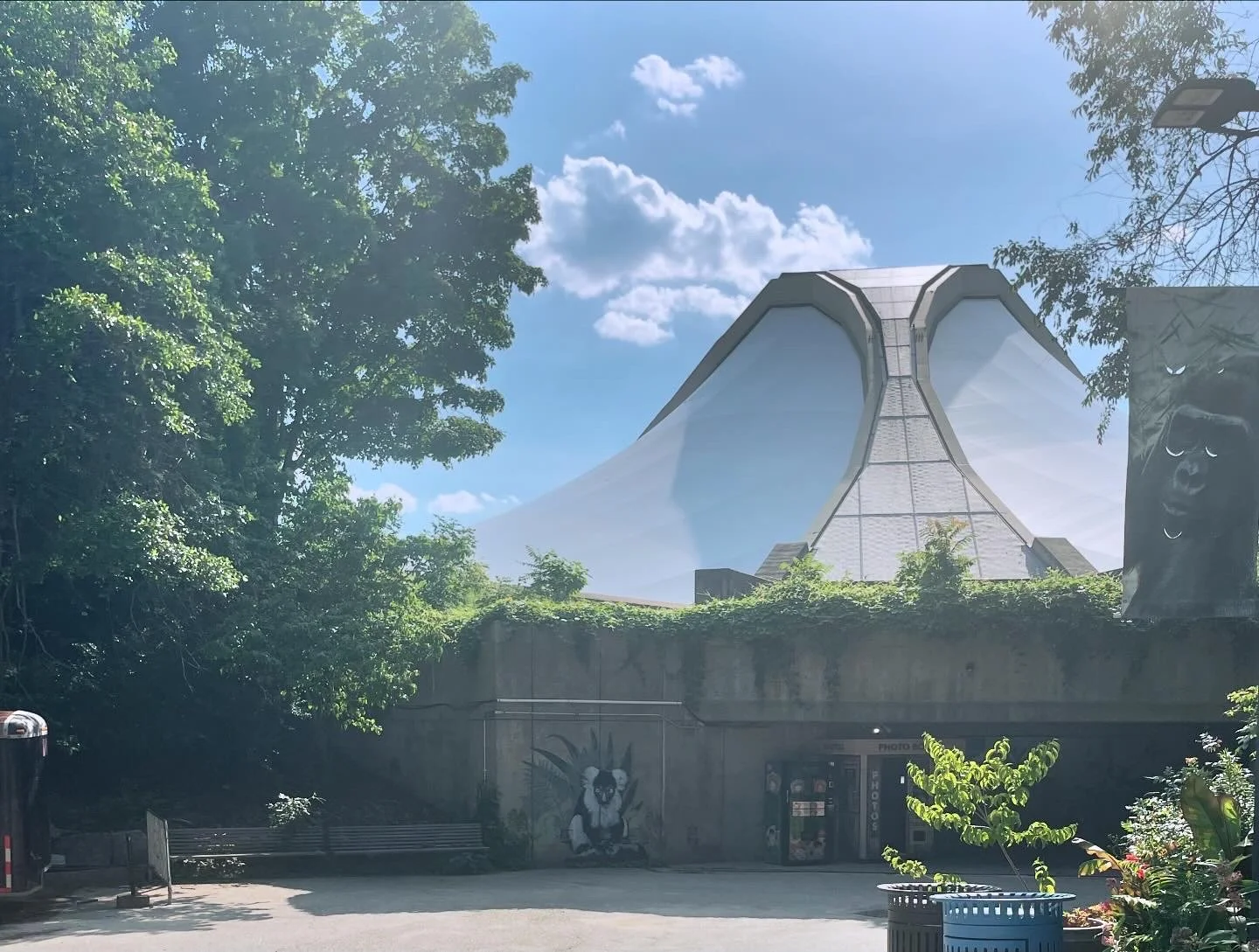 The Tropical Forest Pavilion at Franklin Park Zoo is a soaring, climate-controlled biome that recreates the dense, humid atmosphere of a Central African rainforest. Housed beneath a sweeping barrel-vaulted roof with glass clerestories and steel trusses, the structure allows natural light to filter deep into the interior, supporting lush plant growth and mimicking the dappled light of the forest canopy.